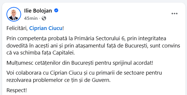 „Felicitări, Ciprian Ciucu! Experiența acumulată la Primăria Sectorului 6, integritatea demonstrată în acești ani și devotamentul față de București îmi dau convingerea că va schimba fața Capitalei. Mulțumesc cetățenilor pentru sprijinul acordat! Voi colabora cu Ciprian Ciucu și cu primarii de sectoare pentru rezolvarea problemelor care țin și de Guvern. Respect!”